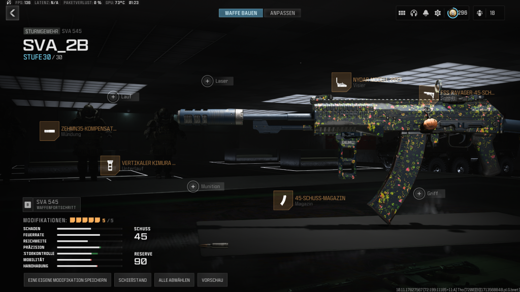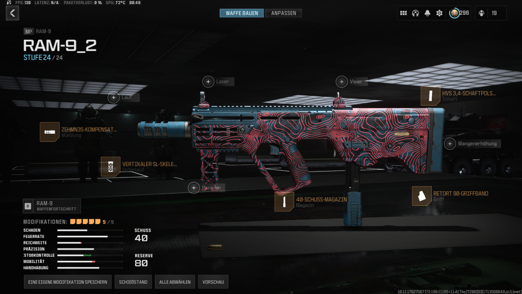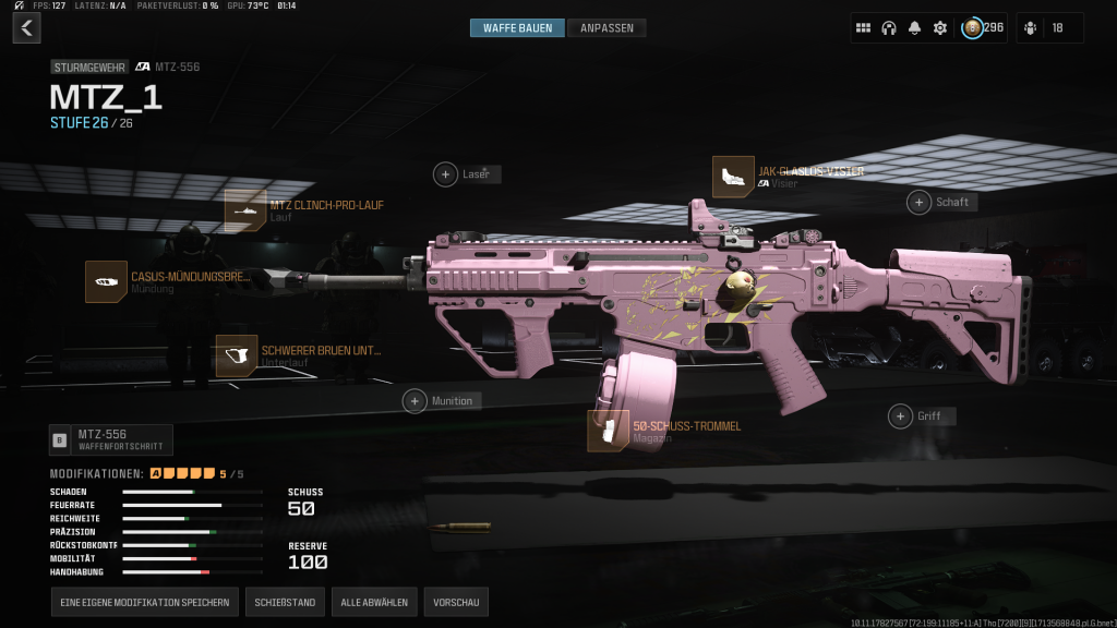 Generell hat die Waffe einen geringen Rückstoß und ist gut zu händeln. Auch hier verwenden wir wieder den ZEHMN35-Kompensations-Mündungsfeuerdämpfer für die erhöhte Rückstoßkontrolle. Der Unterlauf erhöht ebenfalls die Rückstoßkontrolle sowie die Präzision, während der Schaft die Handhabung und die ZV-Geschwindigkeit steigert: