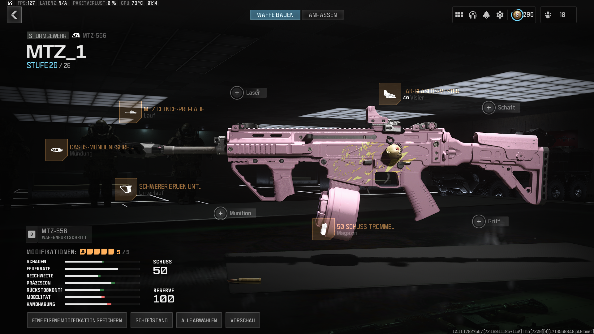 Das Sturmgewehr beeindruckt durch einen geringen Rückstoß und eine gute Schadensreichweite. Als Loadout empfehlen wir einen Schweren Second Line Mammoth-Lauf, um Schaden, Reichweite, Präzision und Mobilität zu steigern. Die Mündung erhöht die Rückstoßkontrolle, während der Unterlauf die Handhabung und die Mobilität steigert: