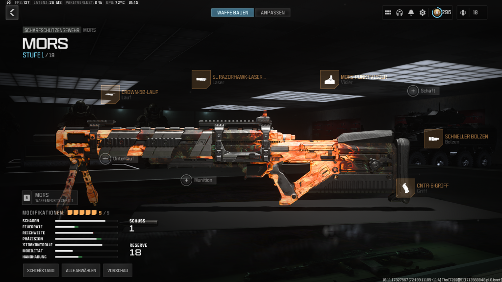 Der Lauf erhöht Reichweite, Rückstoßkontrolle und Schaden der Waffe, während der Unterlauf Präzision und Rückstoßkontrolle steigert. Zwar schränkt die Mündung die ZV-Geschwindigkeit ein, reduziert gleichzeitig den Rückstoß erheblich, ohne Abstriche bei der Reichweite: