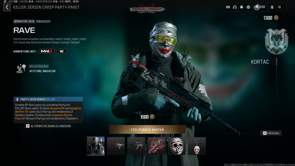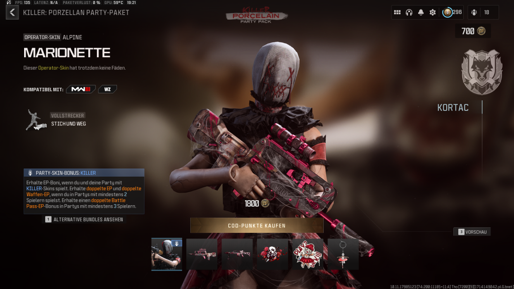 Heute kam ein weiteres KILLER-Bundle in den Shop: das „Killer: Porzellan Party-Paket“. Das beinhaltet eine Marionetten-Figur für den Operator Alpine. Zusätzlich bekommt ihr hier zwei Waffenbaupläne (FR 5,56, Holger 26), ein großes Dekor, einen Waffensticker und einen Talisman. Das Bundle kostet 1.800 CoD-Punkte.