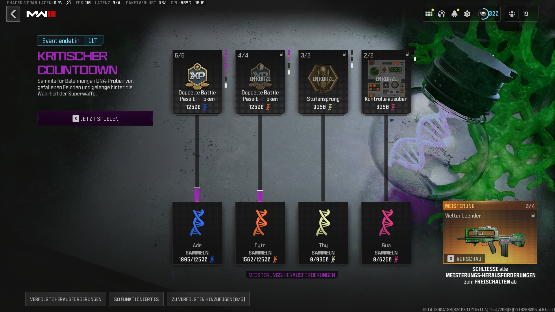 Mit Season 4 zog direkt zu Beginn das erste Event in CoD: MW3 ein. In „Kritischer Countdown“ geht es darum, DNA-Proben von gefallenen Feinden und Mates im Multiplayer und in Warzone einzusammeln und damit Belohnungen freizuschalten. Jede Woche kommt eine neue Art von Proben dazu, die gleichzeitig weitere Belohnungen freischaltet. Das Event läuft insgesamt vier Wochen.