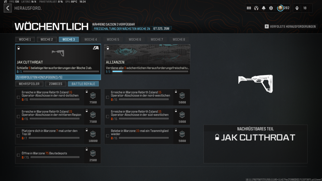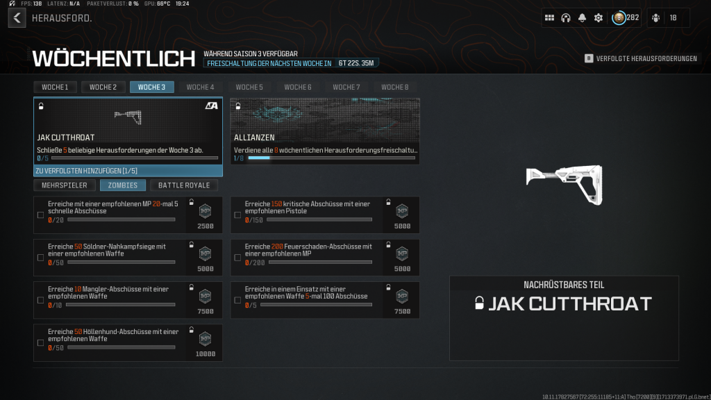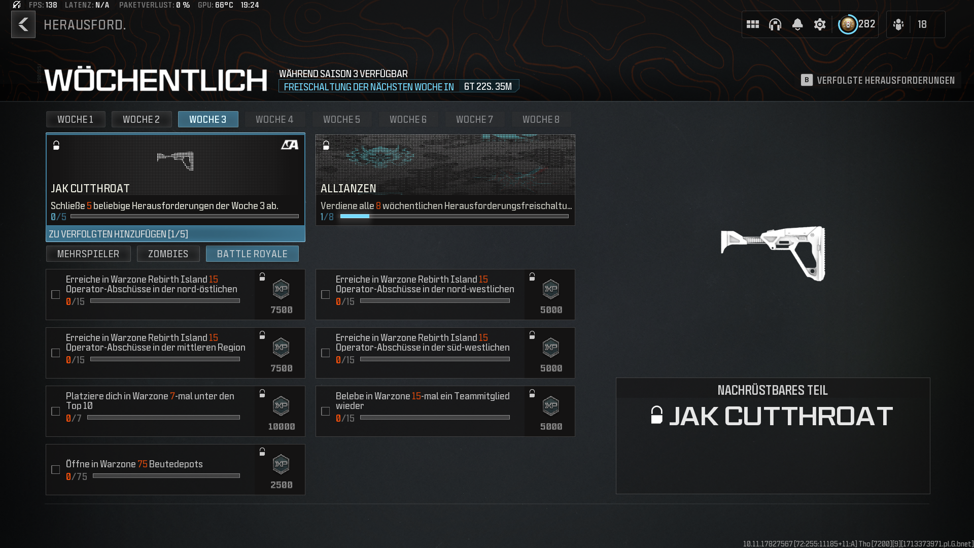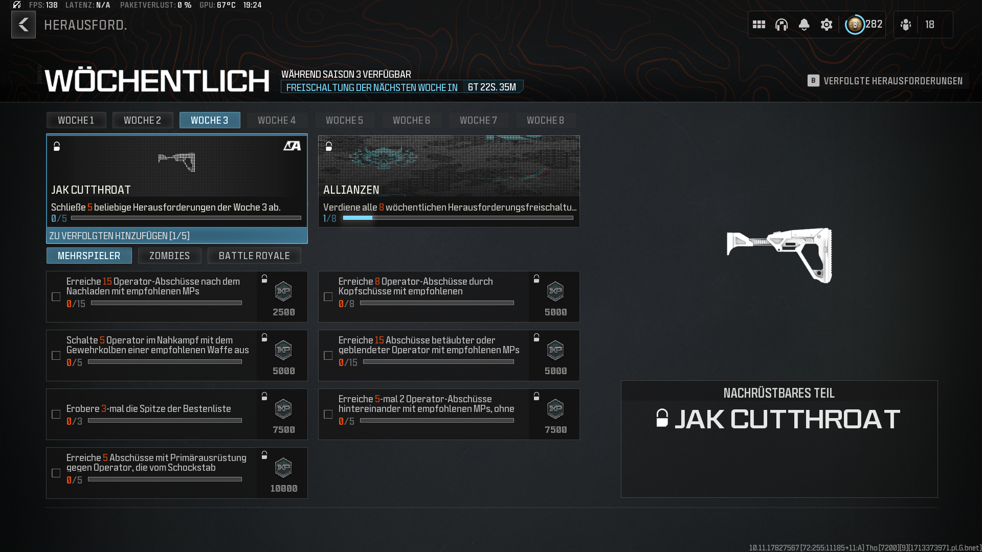 In Woche 3 der Herausforderungen bekommt ihr das nachrüstbare Teil JAK Cutthroat für verschiedene Waffen (MCW, MTZ, M4, AMR9). Der Schaft bietet eine unübertroffene Kombination aus Tempo und Stabilität bei Verwendung der Zielvorrichtung (Visier).