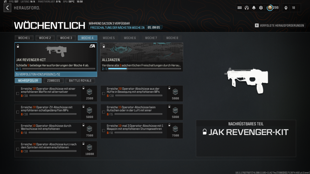 Auch in Season 3 von Call of Duty: Modern Warfare 3 gibt es wieder wöchentliche Aufgaben, mit denen ihr Aftermarket-Teile und den „Allianzen“-Waffenskin freischaltet. In Woche 4 erspielt ihr das JAK Revenger Kit für die BP50. Welche Aufgaben die Woche beinhaltet, erfahrt ihr hier.