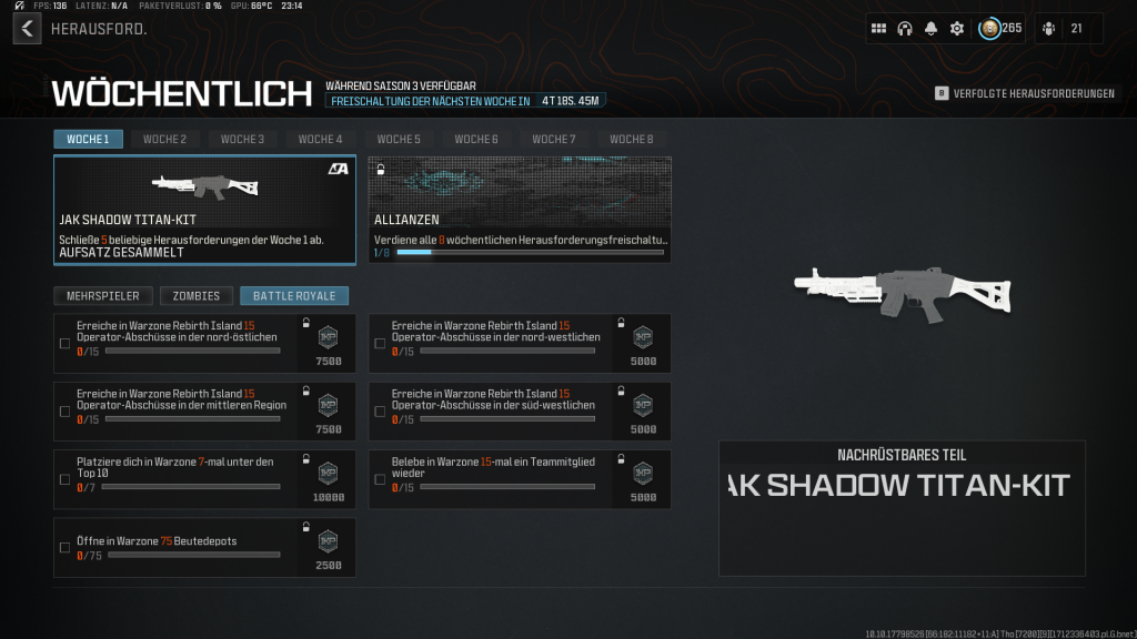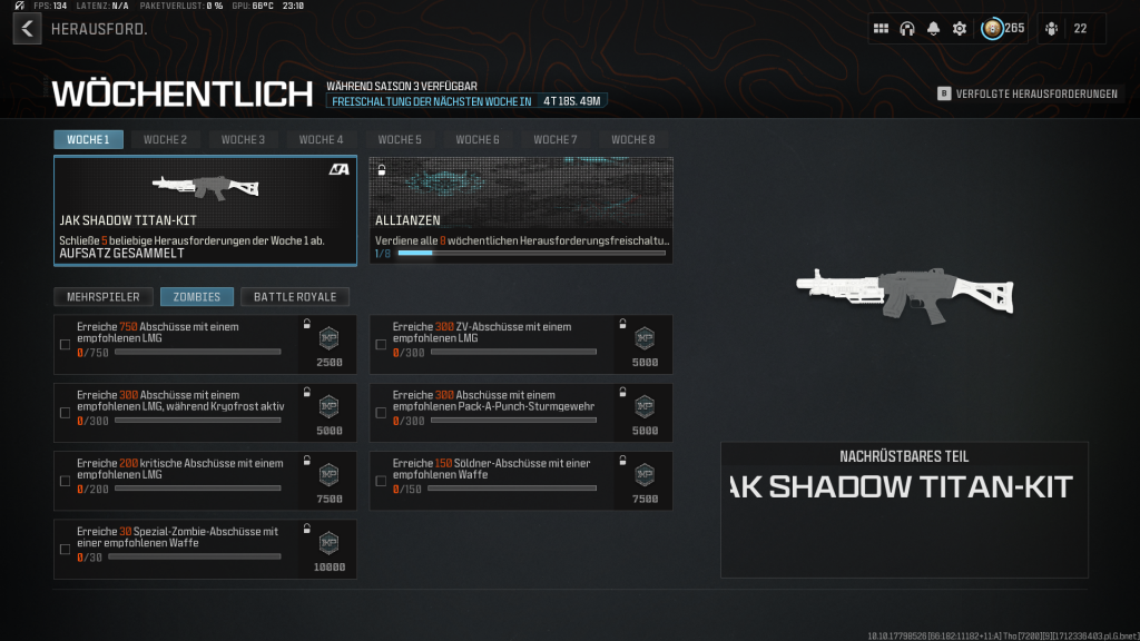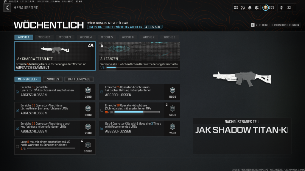 Auch in Season 3 von Call of Duty: Modern Warfare 3 gibt es wieder wöchentliche Aufgaben, mit denen ihr Aftermarket-Teile und den „Allianzen“-Waffenskin freischaltet. In Woche 1 erspielt ihr das JAK Shadow Titan-Kit für die Bruen Mk9. Welche Aufgaben die Woche beinhaltet, erfahrt ihr hier.