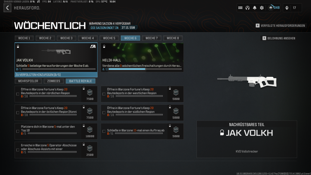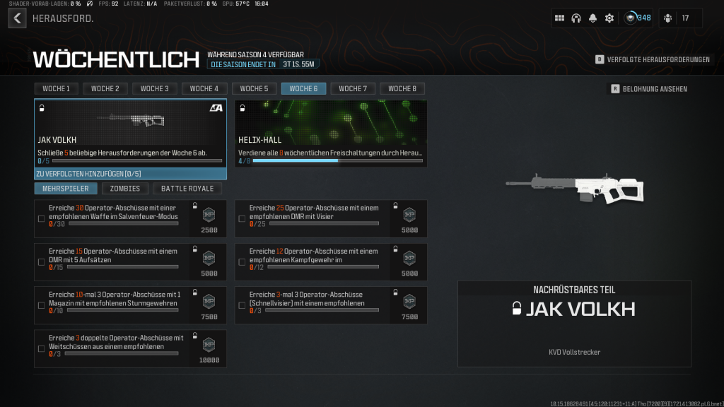 Season 4 ist in Call of Duty: Modern Warfare 3 gestartet und bringt neue wöchentliche Aufgaben mit, mit denen ihr Aftermarket-Teile und den „Helix-Hall“-Waffenskin freischaltet. In Woche 6 erspielt ihr den JAK Volkh für die KV Inhibitor. Welche Aufgaben die Woche beinhaltet, erfahrt ihr hier.