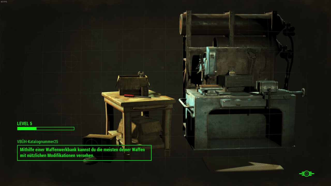 Ihr könnt Werkbänke als Lager verwenden und eure Items dort ablegen, um das Inventar aufzuräumen und nicht zu überladen. Wenn ihr zum ersten Mal einen Fallout-Titel spielt, werdet ihr schnell merken, dass ihr schnell überladen seid, denn: Man kann wirklich so gut wie alles aufsammeln. Und das sollte man auch.