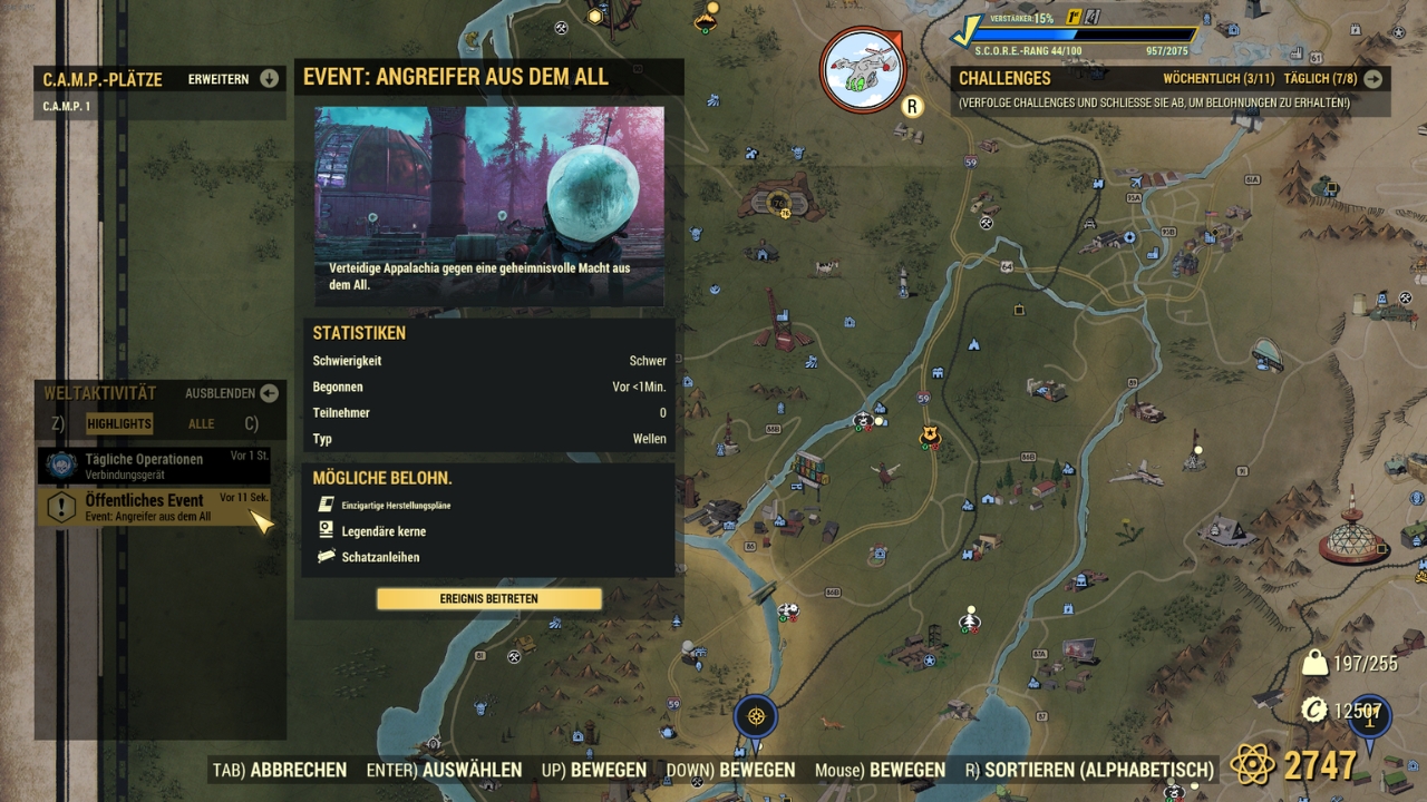 Behaltet zwischendurch einfach ein wenig den Himmel und eure Map im Auge, dort ploppt das Event dann unten links bei „Weltaktivität“ auf und ihr könnt dem Ereignis ganz easy beitreten. Achtet aber darauf, dass noch andere Spielerinnen und Spieler vor Ort sind und startet das Event auf keinen Fall alleine, die Gegnerwellen sind wirklich stark.