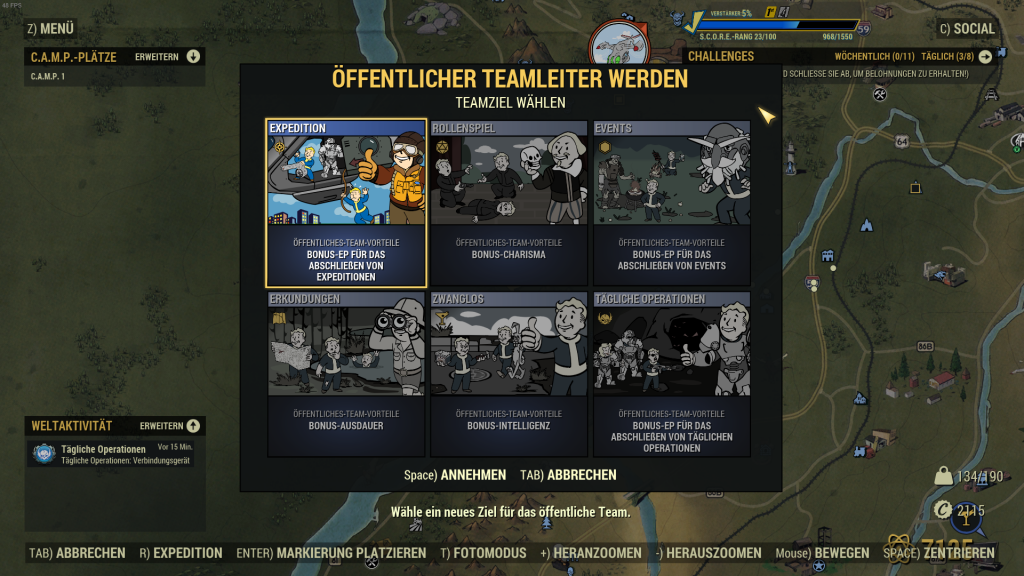 In Fallout 76 gibt es aktuell sechs verschiedene Arten von Teams, die ihr erstellen oder denen ihr beitreten könnt – wenn sie vorhanden sind: Expedition, Rollenspiel, Events, Erkundungen, Zwanglos, Tägliche Operationen.