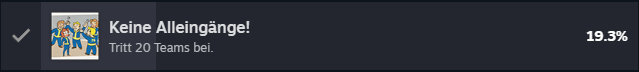 Laut Steam haben die Errungenschaft „Keine Alleingänge!“ jedoch bisher nur 19,3 % der Spieler erreicht. Die Errungenschaft erhaltet ihr, wenn ihr 20 Teams beigetreten seid.
