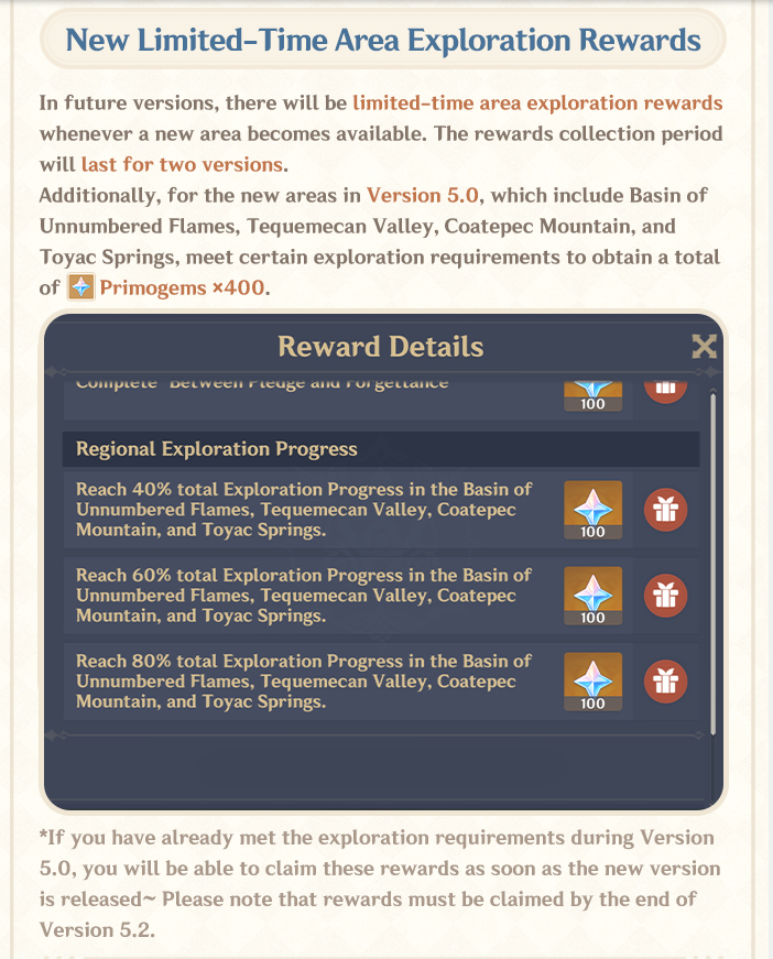 Auch für die Gebiete in Version 5.0 bekommen wir mit dem nächsten Update bereits Belohnungen. Solltet ihr die Bedingungen für die Rewards bereits jetzt erfüllen, erhaltet ihr die Belohnungen nachträglich, sobald dies möglich ist.