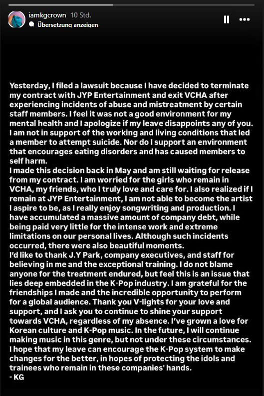 Gestern habe ich Klage eingereicht, weil ich beschlossen habe, meinen Vertrag mit JYP Entertainment zu kündigen und VCHA zu verlassen, nachdem ich Vorfälle von Missbrauch und Misshandlung durch bestimmte Mitarbeiter erlebt habe. Ich habe das Gefühl, dass es keine gute Umgebung für meine psychische Gesundheit war und ich entschuldige mich, wenn mein Ausstieg jemanden von euch enttäuscht. Ich bin nicht für die Arbeits- und Lebensbedingungen, die ein Mitglied zu einem Selbstmordversuch veranlasst haben. Ebenso wenig unterstütze ich ein Umfeld, das Essstörungen fördert und Mitglieder zu Selbstverletzungen veranlasst hat.