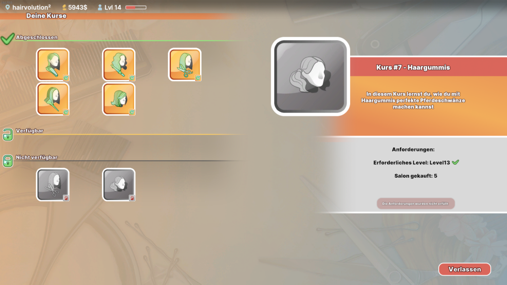 Für die Kurse ist es übrigens eine Voraussetzung, ein bestimmtes Level zu erreichen und eine gewisse Anzahl an Salons zu besitzen. Das bedeutet konkret, dass ihr bestimmte Kurse nicht belegen könnt, wenn ihr nur einen Salon besitzt. Ihr MÜSST erst Geld verdienen und weitere Salons kaufen.