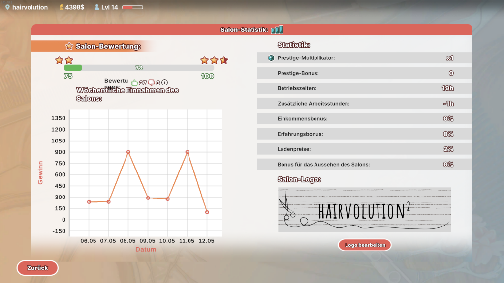 Als mein Salon fertig eingerichtet und der Mitarbeiter eingestellt war, plante ich die Termine für den Tag. Dort stellte ich fest, dass ich nur Termine in dem Salon vergeben kann, in dem ich mich befinde. Um herauszufinden, ob ich trotzdem Geld in dem anderen Salon generiere, rief ich die Statistik auf. Jedoch empfand ich die als so unübersichtlich, dass ich hinterher nicht mehr wusste, als vorher.