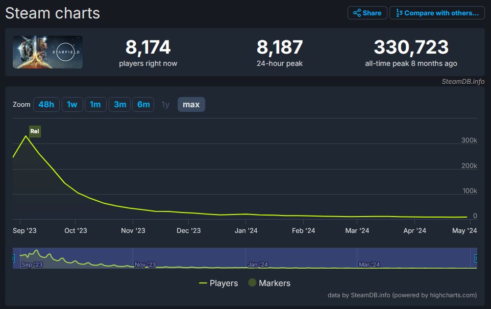 Schaut man sich die Spielerzahlen auf steamdb an, erkennt man, dass zum Release um die 330.000 Leute gespielt haben, Ende Oktober waren es schon nur noch um die 43.000. Aktuell spielen um die 8.000 Leute Starfield – nicht mal ein Jahr später: