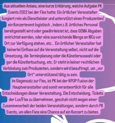 Dazu haben sie, wie ich finde, vorbildlich früh Stellung bezogen. In einer Story erklärten sie, dass sie beim KPop Flex lediglich als örtlicher Veranstalter fungiert haben und keinen Einfluss auf die Veranstaltung selbst hatten.
